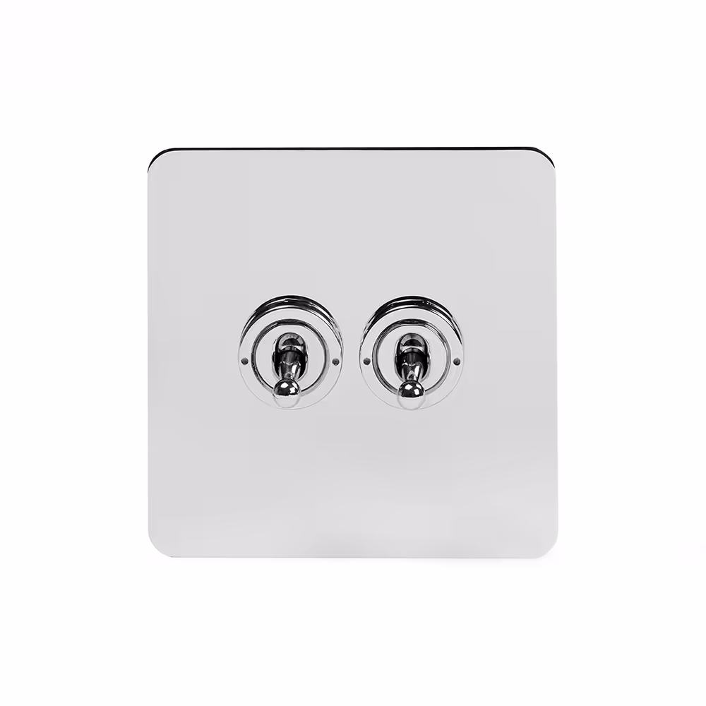 This Polished Chrome [20A 2 Gang 2 Way Toggle Switch] matches beautifully in any interior. It is available with a White or Black Insert and Flat or Traditional plate. Socket and switch finishes are an important consideration for interior design and styling and should be chosen to match their surroundings. If you have polished chrome finishes in your kitchen (unit handles/appliances) or bathroom (towel rails etc), then this collection will provide the perfect compliment.