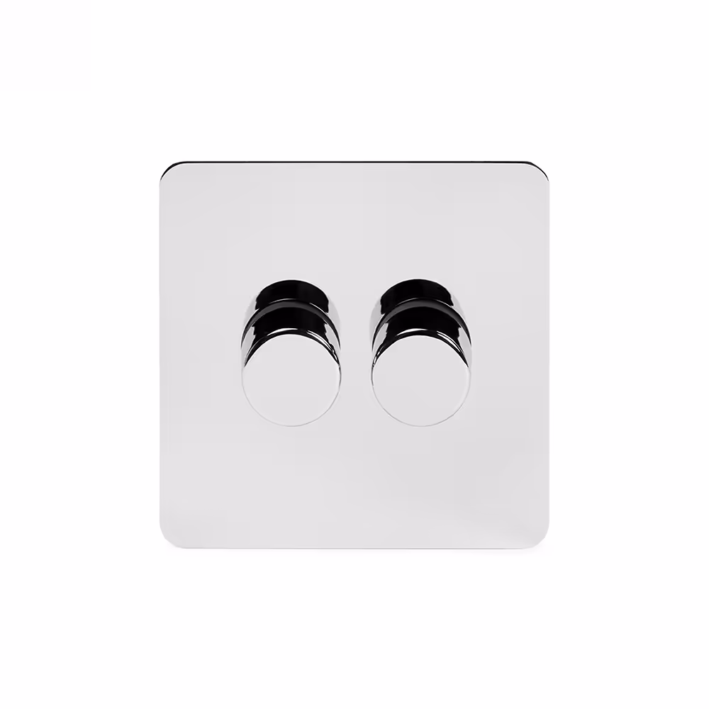 This Polished Chrome [2 Gang 250W LED Intermediate Dimmer Switch] matches beautifully in any interior. It is available with a White or Black Insert and Flat or Traditional plate.