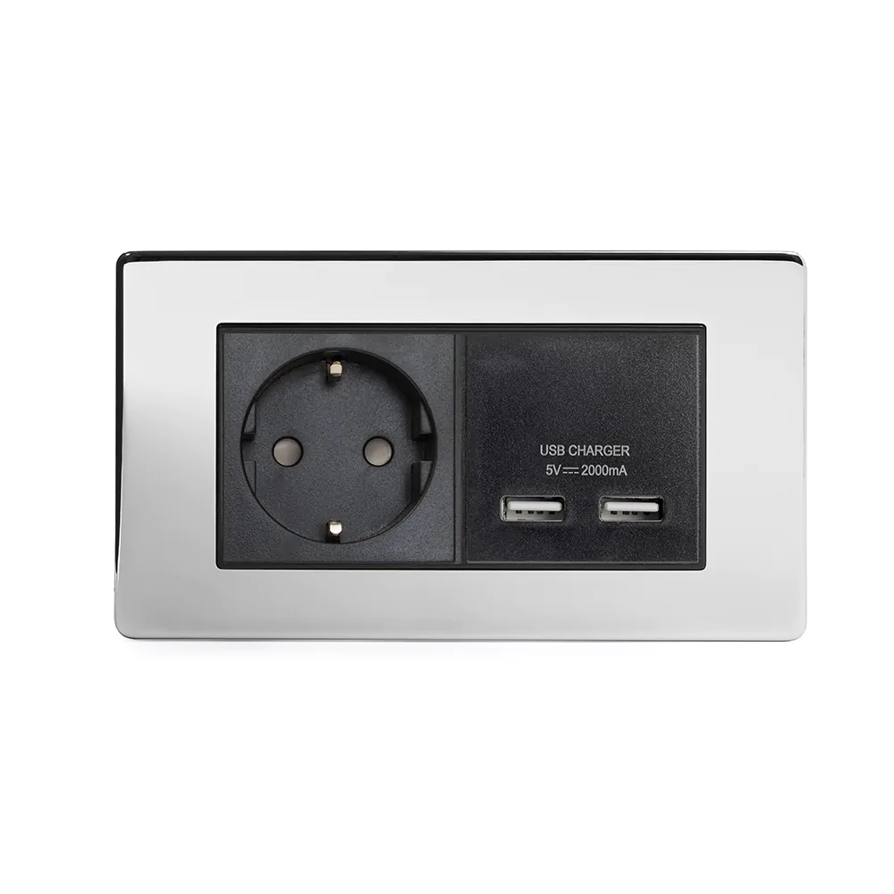 This Polished Chrome [2 Gang European Schuko Socket with USB] matches beautifully in any interior. It is available with a White or Black Insert and Traditional plate.