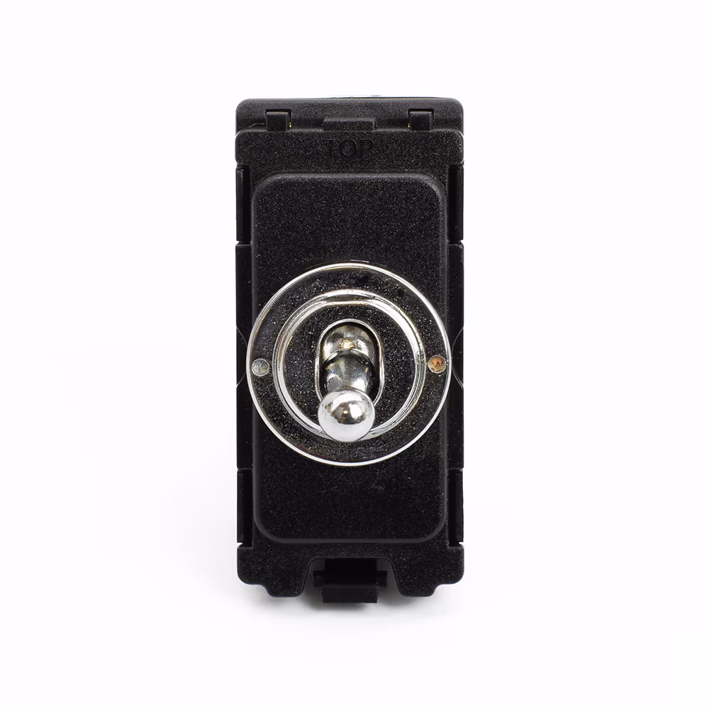 This Polished Chrome [20A 2 Way & Off Retractive CM-Grid Toggle Switch Module] matches beautifully in any interior. It is available with a White or Black Insert and Flat or Traditional plate.