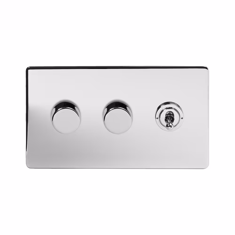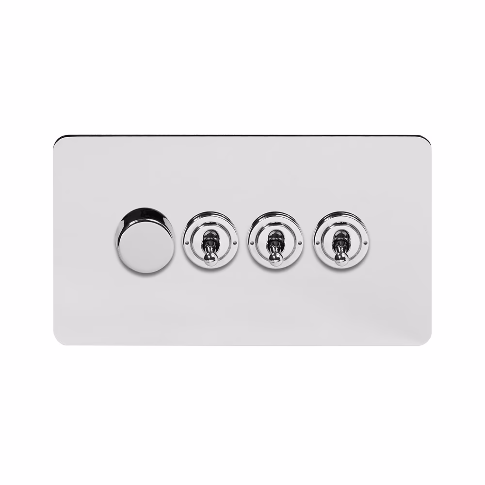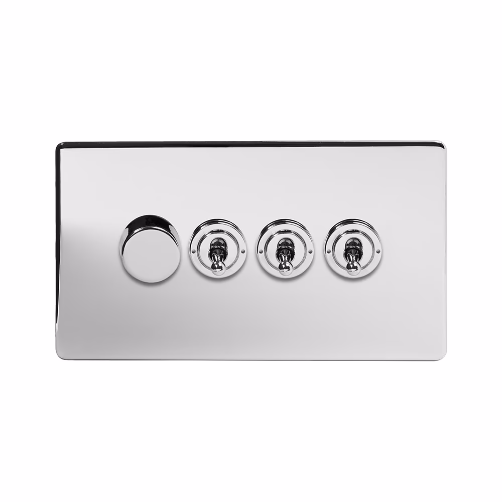 This Polished Chrome [4 Gang Switch with 1 Dimmer] matches beautifully in any interior. It is available with a White or Black Insert and Flat or Traditional plate.