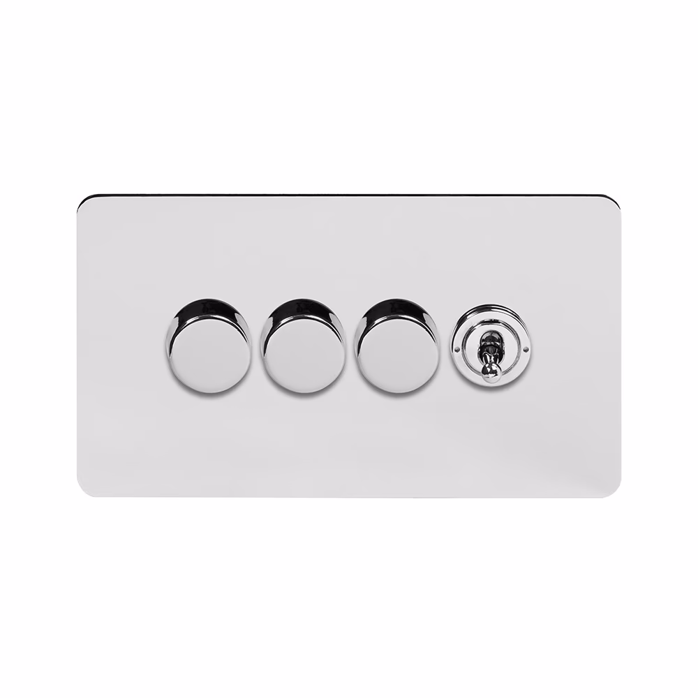 This Polished Chrome [4 Gang Switch with 3 Dimmers] matches beautifully in any interior. It is available with a White or Black Insert and Flat or Traditional plate.