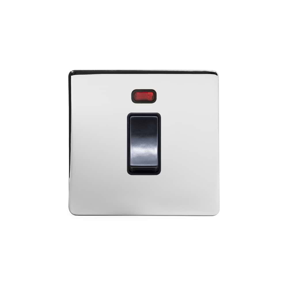 This Polished Chrome [45A 1 Gang Double Pole Switch With Neon] matches beautifully in any interior. It is available with a White or Black Insert and Flat or Traditional plate.