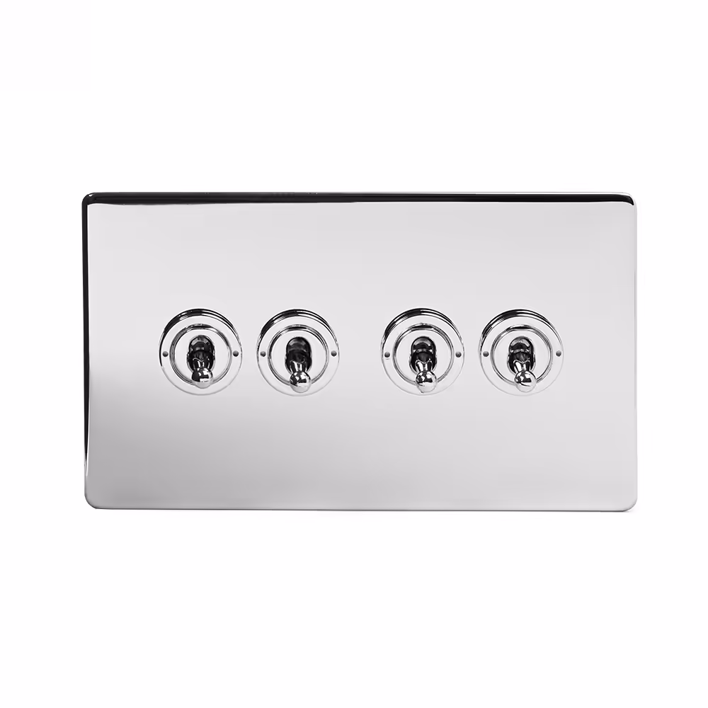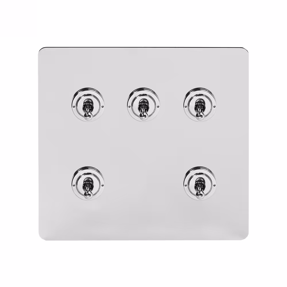 This Polished Chrome [20A 5 Gang 2 Way Toggle Switch] matches beautifully in any interior. It is available with a White or Black Insert and Flat or Traditional plate. Socket and switch finishes are an important consideration for interior design and styling and should be chosen to match their surroundings. If you have polished chrome finishes in your kitchen (unit handles/appliances) or bathroom (towel rails etc), then this collection will provide the perfect compliment.