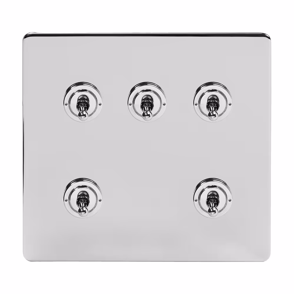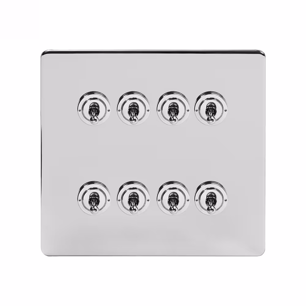 This Polished Chrome [20A 6 Gang 2 Way Toggle Switch] matches beautifully in any interior. It is available with a White or Black Insert and Flat or Traditional plate. Socket and switch finishes are an important consideration for interior design and styling and should be chosen to match their surroundings. If you have polished chrome finishes in your kitchen (unit handles/appliances) or bathroom (towel rails etc), then this collection will provide the perfect compliment.