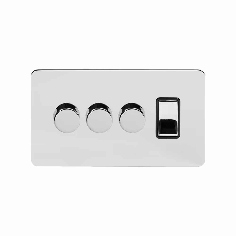 This Polished Chrome [4 Gang Switch with 3 Dimmers (3 x 2-Way intelligent Dimmer & 1 x 2-Way Switch)] matches beautifully in any interior. It is available with a White or Black Insert and Flat or Traditional plate.