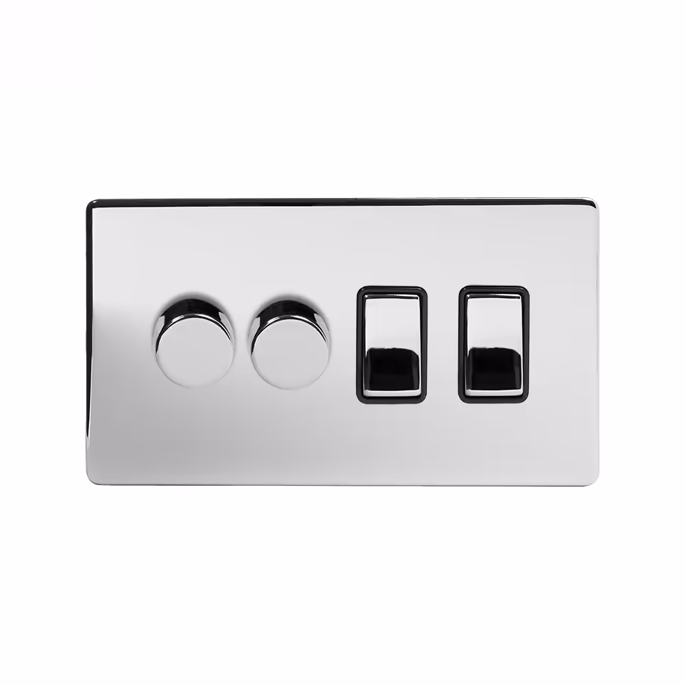This Polished Chrome [4 Gang Dimmer and Rocker Switch Combo (1 x 2-Way intelligent Dimmer & 3 x 2-Way Switch)] matches beautifully in any interior. It is available with a White or Black Insert and Flat or Traditional plate.