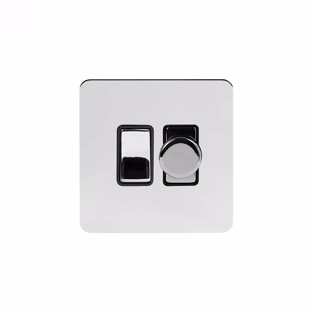 This Polished Chrome [Dimmer and Rocker Switch Combo (2-Way Switch & 2-Way Intelligent Dimmer)] matches beautifully in any interior. It is available with a White or Black Insert and Flat or Traditional plate.